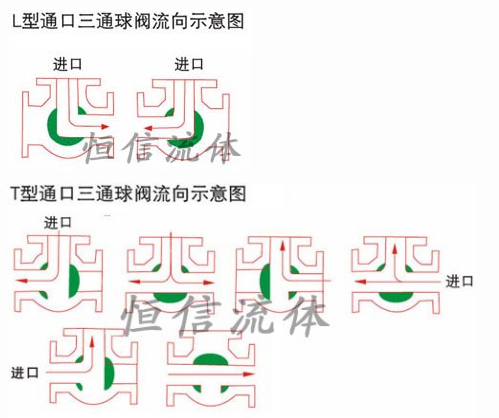 三通球閥分為L型和T型,L型適用于介質的流向切換,能使相互垂直的兩個通道聯通,T型適用于介質的分流,合流或流向切換。